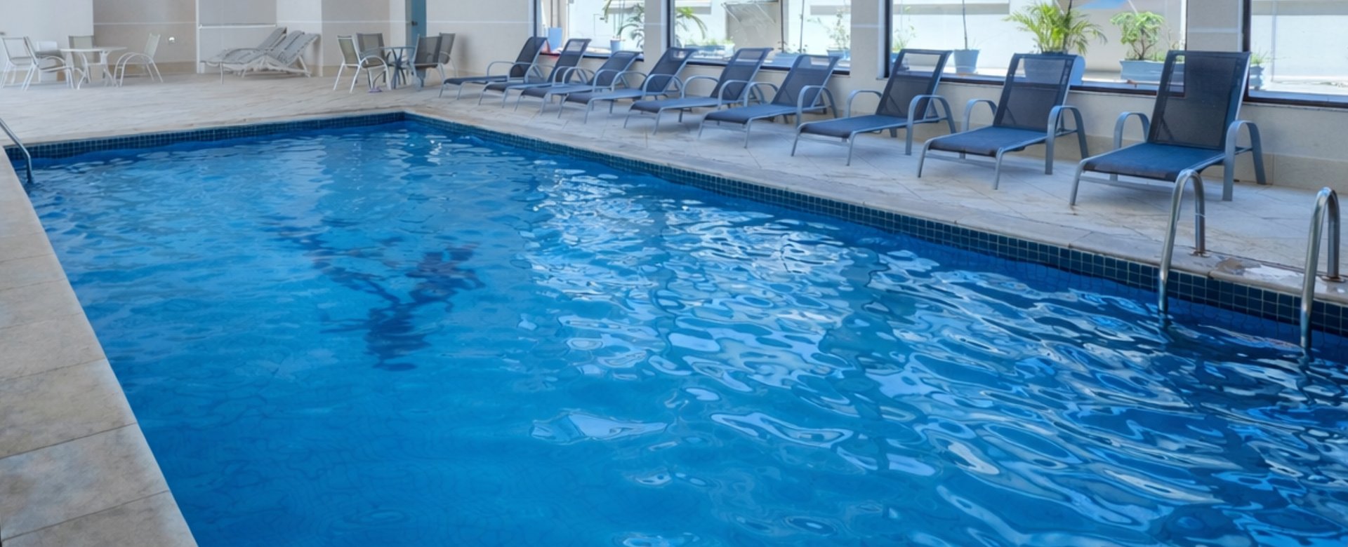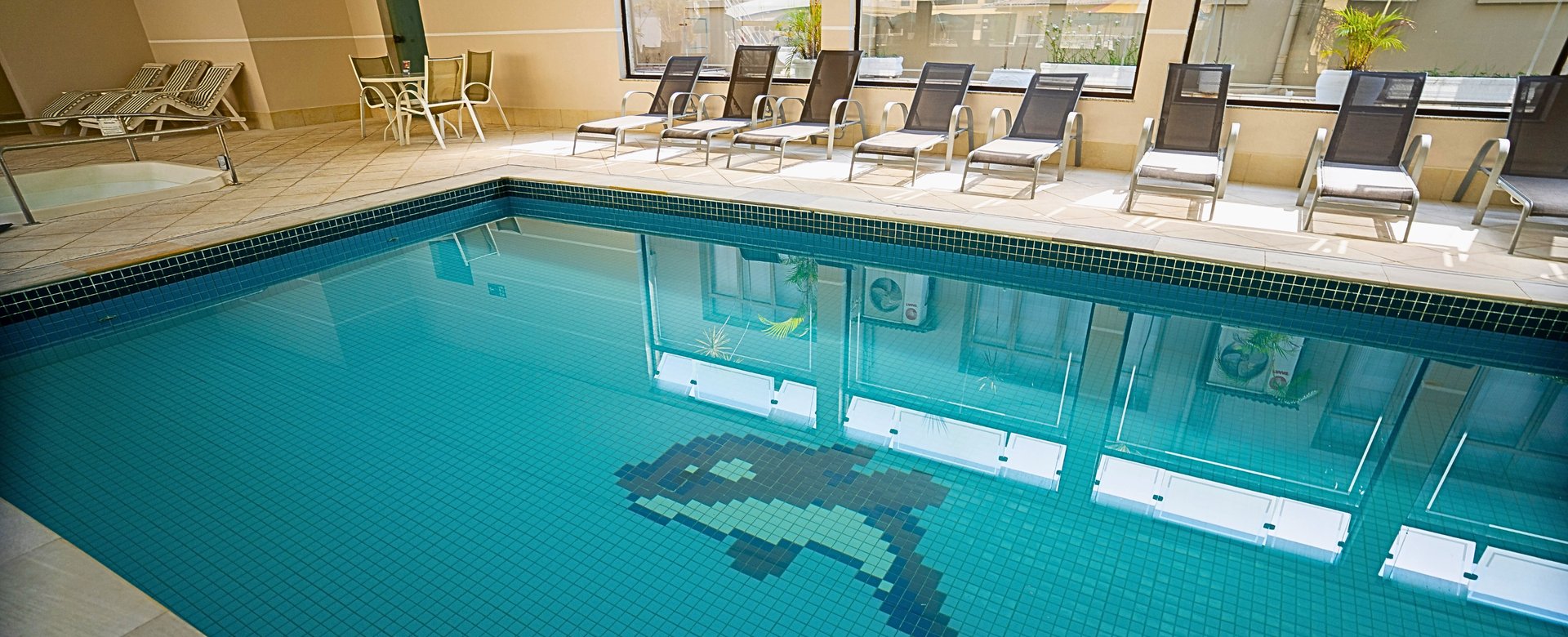 Piscina aquecida e fechada, ideal para relaxamento em qualquer época do ano.