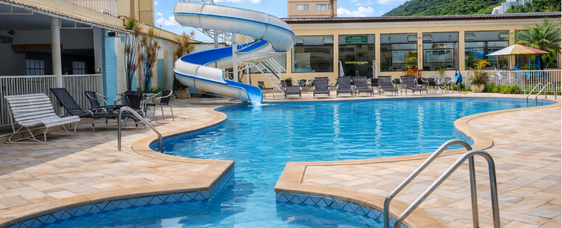 Uma grande piscina climatizada ao ar livre, perfeita para lazer e diversão, equipada com um emocionante toboágua.