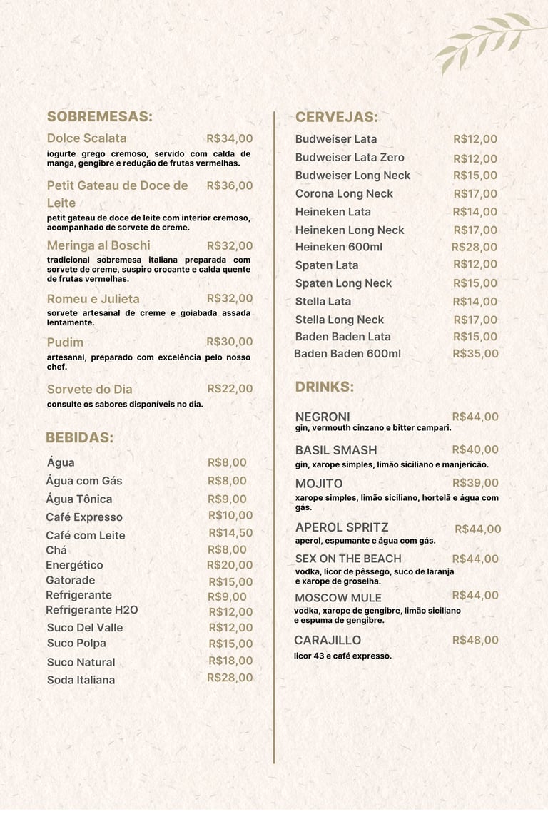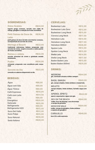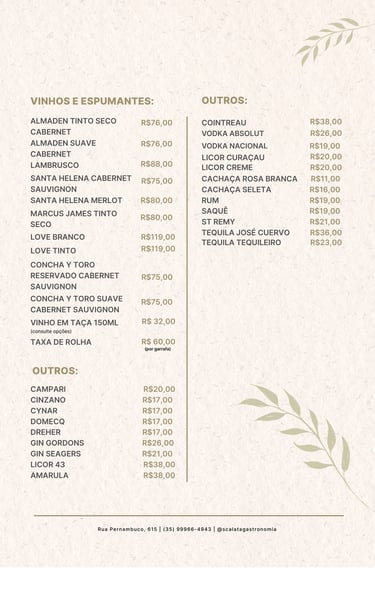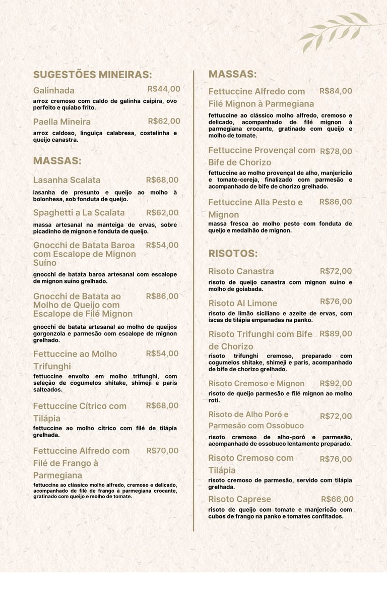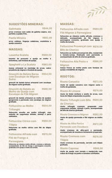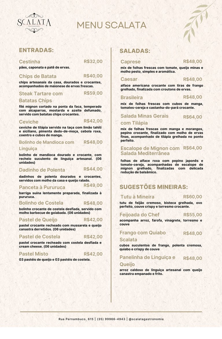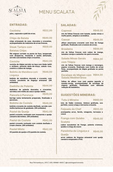 No Scalata Gastronomia, cada prato é uma obra de arte, preparada com ingredientes selecionados e um toque especial de sabor e sofisticação. Nossa cozinha combina tradição e inovação para proporcionar uma experiência única a cada visita.
